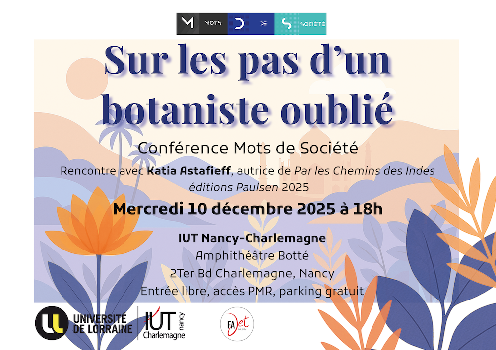 Katia Astafieff est biologiste de formation et autrice de récits de voyages, de documentaires sur la botanique et de romans et ouvrage pour la jeunesse. Originaire de Nancy et grande voyageuse, elle vient présenter son dernier livre paru Par les chemins des Indes, qui retrace le voyage du botaniste Victor Jacquemont ainsi que le sien.
